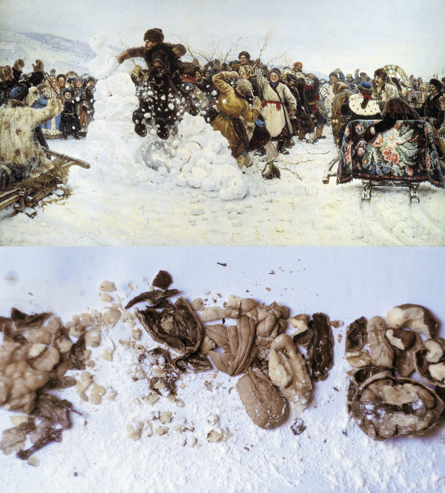 Vasily Surikov “The Capture of the Snow Town”, 1891. My version: paper, nuts, flour.