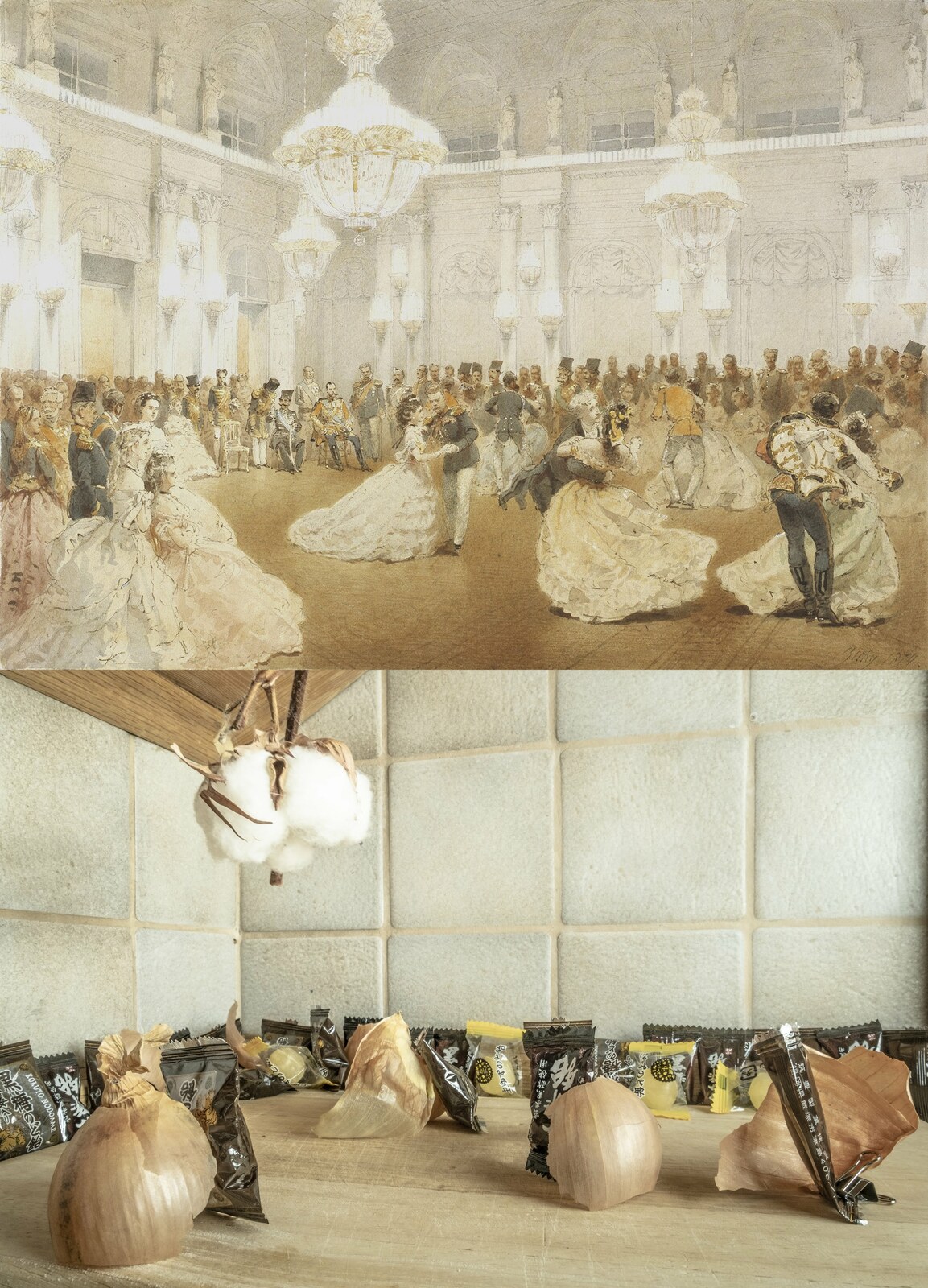 Mihai Zichy - “Ball in the Concert Hall of the Winter Palace during the official visit of Shah Nasir ad-Din in May 1873”. My version: candy, bulbs, paper clips, a board, a cotton flower.