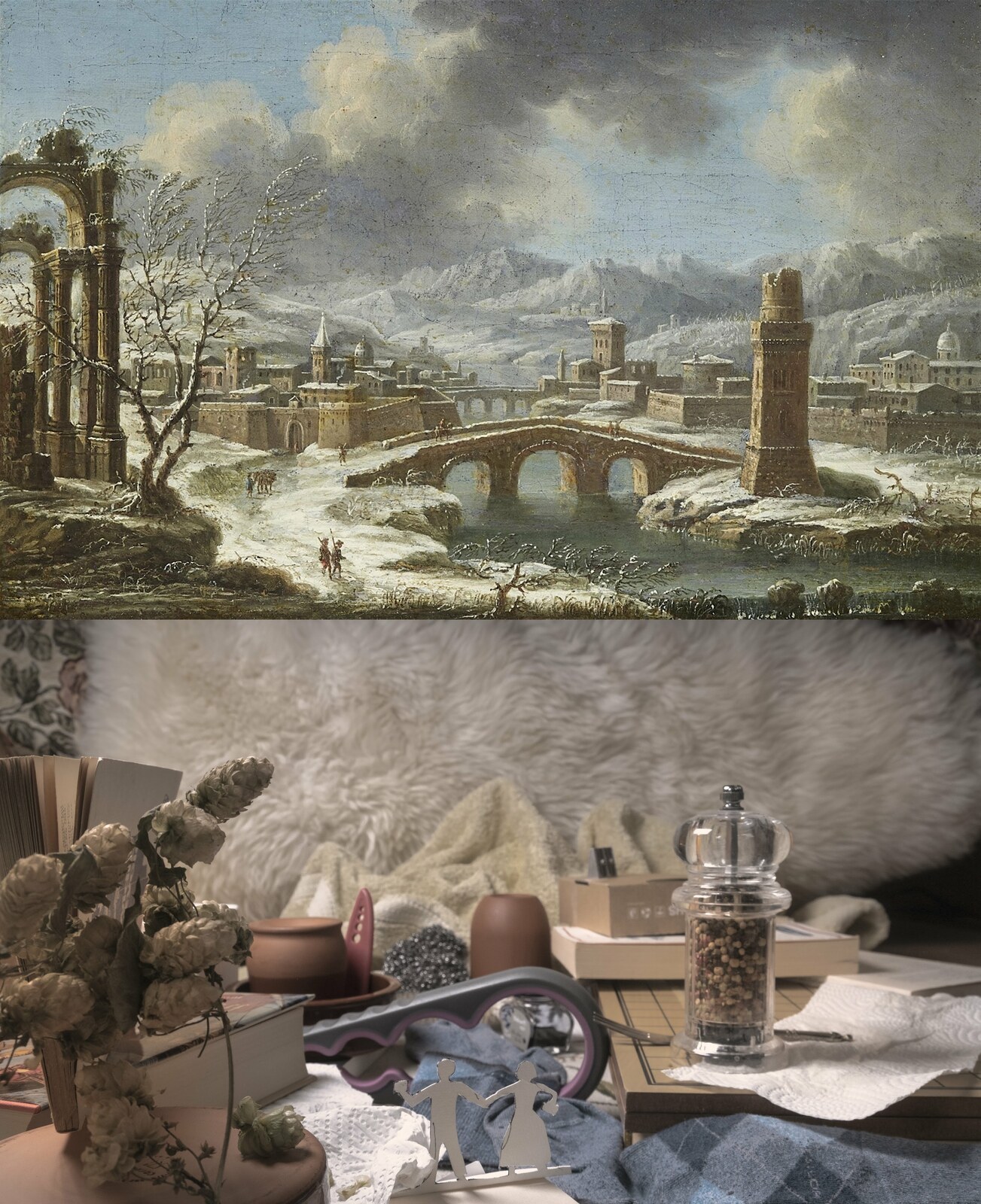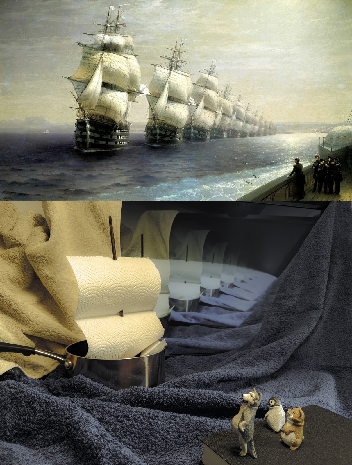 Ivan Aivazovsky, “Review of the Black Sea Fleet in 1849”. My version: a saucepan, kitchen towels, a stick, 2 towels, a camera and a monitor, a book and several figurines of fat animals from Japan.