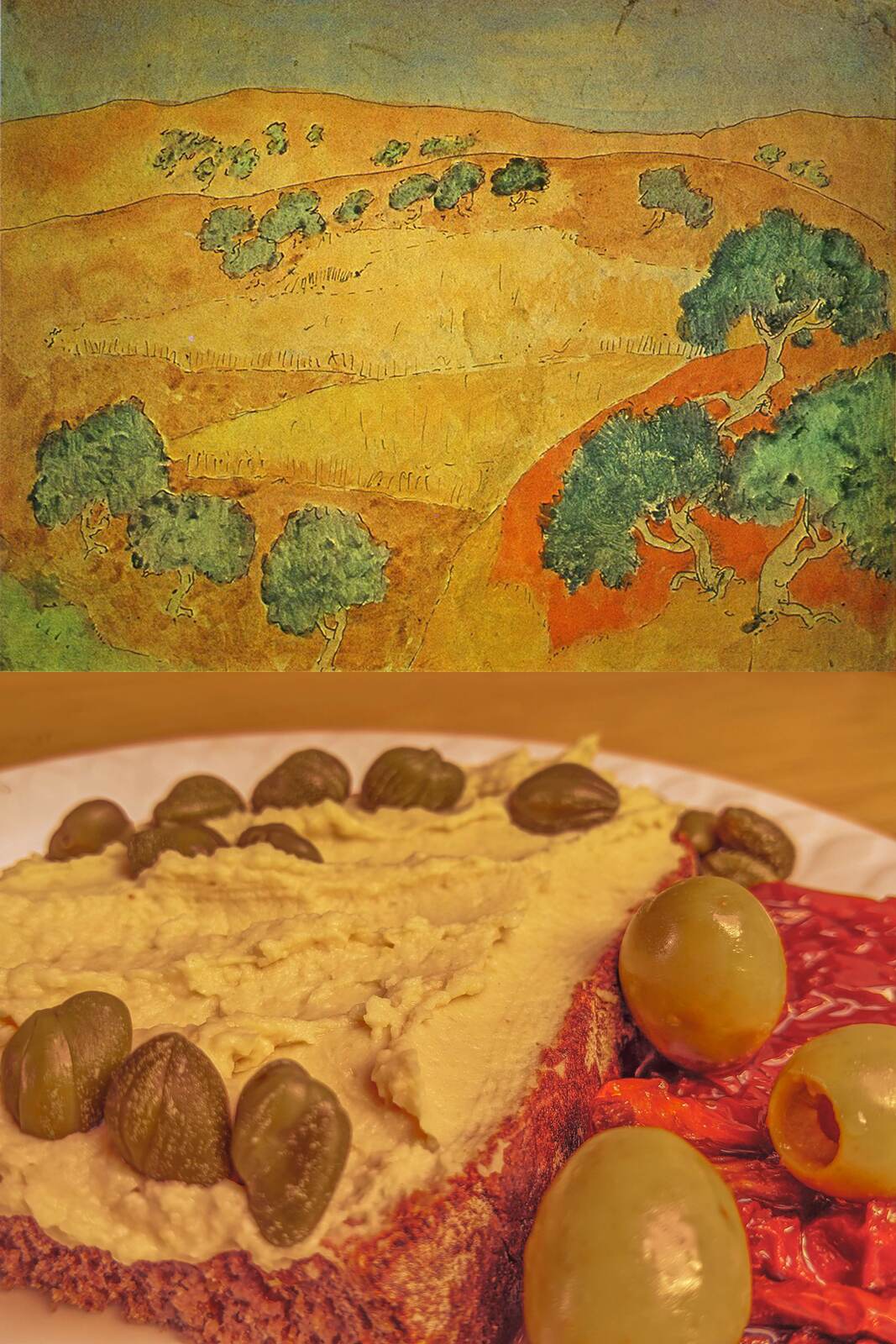 Pablo Picasso — Barcelona, Summer Landscape, 1902, and my hummus, olives, and capers sandwich on dark bread, with dried tomatoes in oil next to it. You could say, an artist's breakfast.