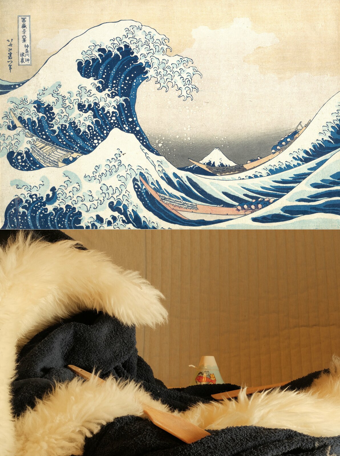 “The Great Wave off Kanagawa” by Katsushika Hokusai (towel, sheepskin, souvenir salt shaker from Japan, two stir-fry spatulas)