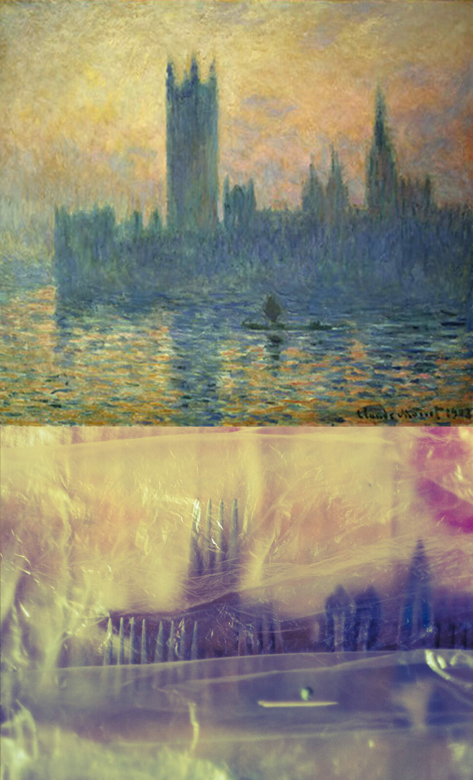 Houses of Parliament in London, Claude Monet (included in the picture: 5 forks, 2 knives, 2 teaspoons, broken toothpicks, green peppercorns, batik T-shirt, plastic bag)